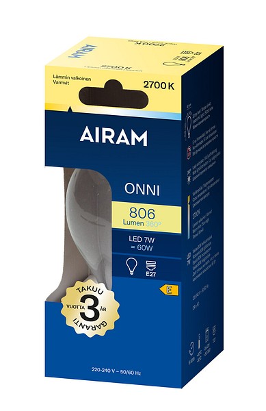 Klar standardkupolformad filament-LED-lampa 7 W, färgtemperatur varmvit 2700 K, E27-sockel, 806 lm, brinntid ca 15 000 h, storlek ø 60 × 108 mm, pappförpackning. Frekvens ~50/60 Hz. Lampan har en helt rundstrålande ljusfördelning och passar bra för plafonder och bordslampor. Arbetstemperaturområde –30 ... +40 °C. Bra färgåtergivningsindex CRI > 80. Jämnt och stabilt spektrum utan färgförvrängningar. Ingen UV- eller IR-strålning. Innehåller inte kvicksilver. Tre års garanti.