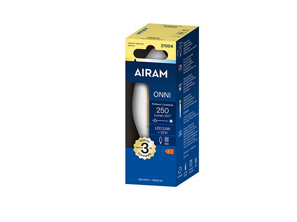 Klar ljuskupig filament LED-lampa 2,5W, färgtemperatur varmvit 2700K, E14-sockel, 250 lm, livslängd ca 15 000 h, mått ø 35 x 97 mm, kartongförpackning. Frekvens ~50/60 Hz. Lampan har helt omgivande ljusfördelning, passar bra i plafonder och bordslampor. Drifttemperaturområde -30 … +40 °C. Bra färgåtergivningsindex CRI > 80. Kontinuerligt jämnt spektrum, inga färgförvrängningar. Ingen UV- eller IR-strålning. Innehåller ej kvicksilver. Tre års garanti.