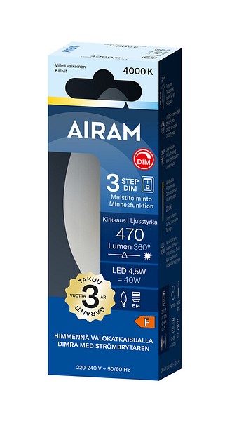 Opal LED-lampa med ljusform som stearinljus, 3-stegs dimbar filamentlampa 4,5W, klarvit färgtemperatur 4000K, E14-sockel, 470 lm, livslängd ca 15 000 h, storlek ø 35 x 97 mm, pappförpackning. Dimbar LED-lampa med vanlig strömbrytare, tre ljusnivåer: 100 %, 50 % och 7 %. Frekvens ~50/60 Hz. Bra färgåtergivningsindex CRI > 80. Jämnt och stabilt spektrum, inga färgförvrängningar. Ingen UV- eller IR-strålning. Innehåller inte kvicksilver. Tre års garanti.