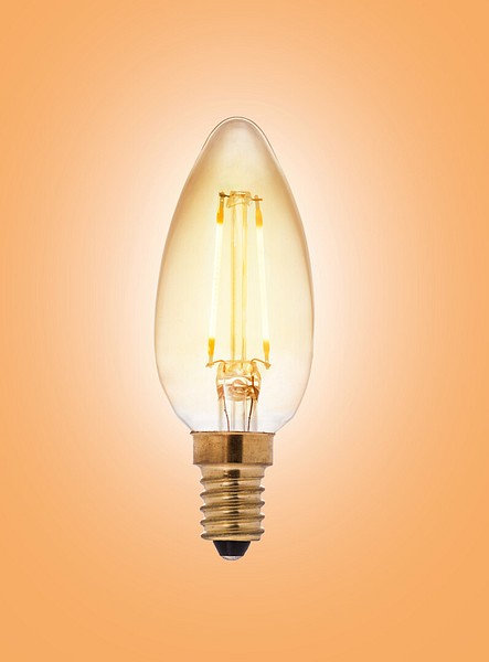 Decor Amber-seriens klara kronkupiga filament-LED-lampa 2,5W, färgtemperatur varm gul 2200K, E14-sockel, 225 lm, livslängd ca 15 000 h, storlek ø 35 x 97 mm, kupa i glas, kupans färg bärnsten, kartongförpackning. Frekvens ~50/60Hz. Lampan har helt rundstrålande ljusfördelning och passar utmärkt för platser där lampan är synlig. Driftstemperaturområde -20 ... +40 °C. Bra färgåtergivningsindex CRI > 80. Kontinuerligt jämnt spektrum, inga färgförvrängningar. Ingen UV- eller IR-strålning. Innehåller inte kvicksilver. Tre års garanti.