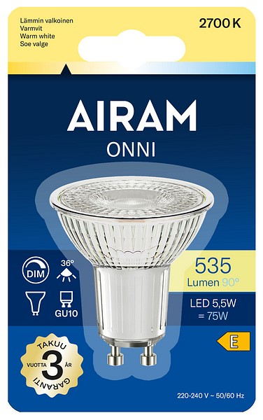 Klar PAR16-spotglas dimbar LED-lampa 5,5W, färgtemperatur varmvit 2700K, GU10-sockel, 535lm 900cd 36°, livslängd ca 25000h, storlek ø 50 x 54 mm, glas, blisterförpackning. Frekvens ~50/60Hz. Driftstemperaturområde -30 ... +40 °C. Bra färgåtergivningsindex CRI > 80. Kontinuerligt jämnt spektrum, inga färgförvrängningar. Ingen UV- eller IR-strålning. Innehåller inget kvicksilver. Tre års garanti.