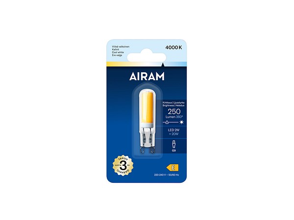 Klar glödlampkupa LED-lampa 2W, färgtemperatur klarvit 4000K, G9-sockel, 250 lm, livslängd ca 15 000 h, mått ø 14 x 60 mm, glaslykta, blisterförpackning. Frekvens ~50 Hz. Drifttemperaturområde -30 … +40 °C. Bra färgåtergivningsindex CRI > 80. Kontinuerligt jämnt spektrum, inga färgförvrängningar. Ingen UV- eller IR-strålning. Innehåller ej kvicksilver. Tre års garanti.