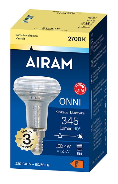 Opal R50-spot med kupformad lins LED-lampa 4W, färgtemperatur varmvit 2700K, E14-sockel, 345 lm, livslängd ca 15 000 h, storlek ø 50 x 84 mm, blisterförpackning. Frekvens ~50/60Hz. Driftstemperaturområde -30 ... +40 °C. Bra färgåtergivningsindex CRI > 80. Kontinuerligt jämnt spektrum utan färgförvrängning. Ingen UV- eller IR-strålning. Innehåller inte kvicksilver. Tre års garanti.
