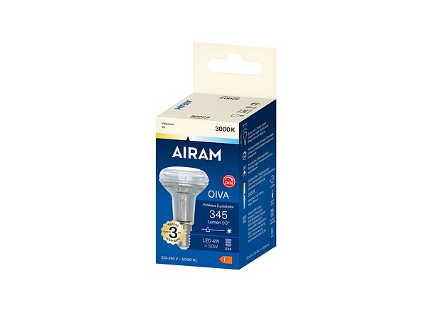 Klar R50-spotglas dimbar LED-lampa 4W, färgtemperatur renvit 3000K, E14-sockel, 345lm, livslängd ca 15000h, storlek ø 50 x 84 mm, glas, kartongförpackning. Frekvens ~50/60Hz. Driftstemperaturområde -20 ... +40 °C. Bra färgåtergivningsindex CRI > 80. Kontinuerligt jämnt spektrum, inga färgförvrängningar. Ingen UV- eller IR-strålning. Innehåller inget kvicksilver. Tre års garanti.