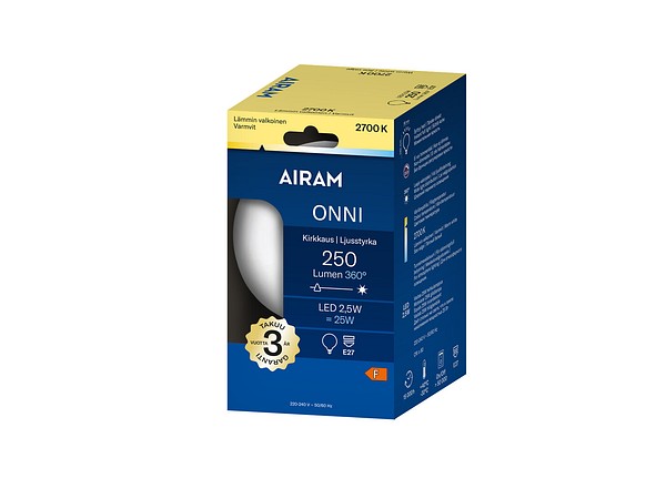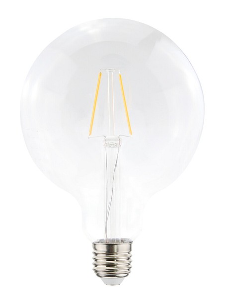 Filament LED-lampa med klar rund kupa, 2,5 W, färgtemperatur varm vit 2700K, E27-sockel, 250 lm, livslängd ca 15 000 h, storlek Ø 95 x 140 mm, kartongförpackning. Frekvens ~50/60 Hz. Lampan har helt omgivande ljusfördelning, passar utmärkt i plafonder och bordslampor. Driftstemperaturområde -30 … +40 °C. God färgåtergivning CRI > 80. Jämnt kontinuerligt spektrum utan färgförvrängning. Inget UV- eller IR-ljus. Innehåller inget kvicksilver. Tre års garanti.