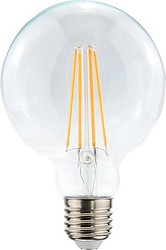 Klar glaskupa filament LED-lampa dimbar 4,5W, färgtemperatur varmvit 2700K, E27, 470 lm, livslängd ca. 15000 h, storlek ø 95 x 140 mm, kartongförpackning. Frekvens ~50/60 Hz. Lampan har helt omgivande ljusfördelning, passar bra i plafonder och bordslampor. Driftstemperaturområde -30 ... +40 °C. Hög färgåtergivningsindex CRI > 80. Kontinuerligt jämnt spektrum, inga färgförvrängningar. Ingen UV- eller IR-strålning. Innehåller inget kvicksilver. Tre års garanti.