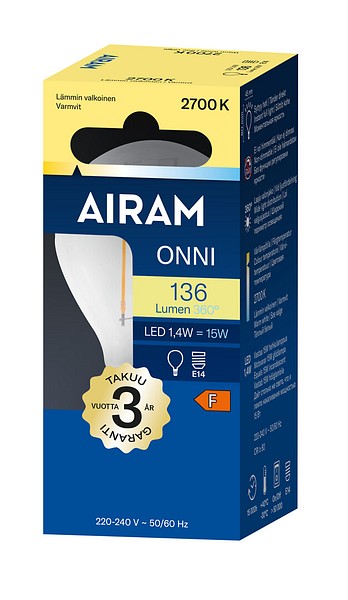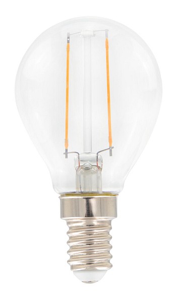 Klar liten kupformad filament-LED-lampa 1,4 W, färgtemperatur varmvit 2700 K, E14-sockel, 136 lm, livslängd ca 15 000 h, storlek ø 45 x 80 mm, kartongförpackning. Frekvens ~50/60 Hz. Lampan har helt rundstrålande ljusfördelning, lämplig för plafonder och bordslampor. Driftstemperaturområde -30 ... +40 °C. Bra färgåtergivningsindex CRI > 80. Jämnt kontinuerligt spektrum, inga färgförvrängningar. Ingen UV- eller IR-strålning. Innehåller inget kvicksilver. Tre års garanti.