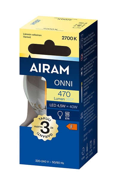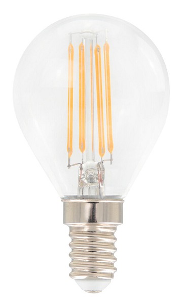 Klar liten kupolformad filament-LED-lampa 4,5 W, färgtemperatur varmvit 2700 K, E14-sockel, 470 lm, brinntid ca 15 000 h, storlek ø 45 × 80 mm, pappförpackning. Frekvens ~50/60 Hz. Lampan har en helt rundstrålande ljusfördelning och passar bra för plafonder och bordslampor. Arbetstemperaturområde –30 ... +40 °C. Bra färgåtergivningsindex CRI > 80. Jämnt och stabilt spektrum utan färgförvrängningar. Ingen UV- eller IR-strålning. Innehåller inte kvicksilver. Tre års garanti.