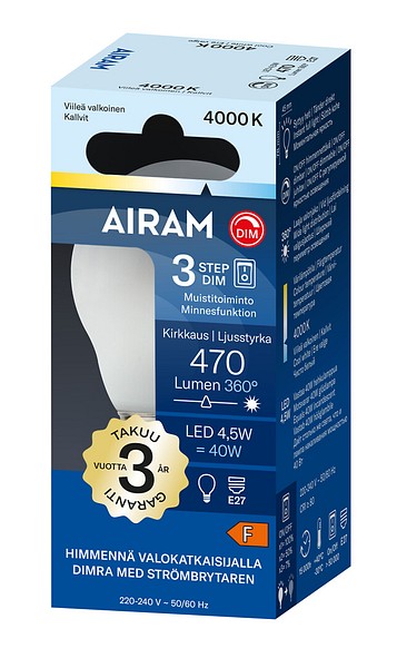 Med 3-Step-DIM -lamporna byter du lätt stämningen i ditt hem, du kan justera lampornas ljusnivå stegvis från en helt vanlig ljusbrytare! Du behöver ingen separat dimmer. När strömbrytaren slås på är lampans ljusstyrkenivå 100 %. Lampan dimmas när man trycker på nytt på ljusbrytaren inom tre sekunder. Minnesfunktion: när lampan släcks helt sparas den senaste dimningsinställningen. Lamporna har en vacker opalkupa i helglas. Ljusets färgtemperatur är svalt vit 4000 K.
