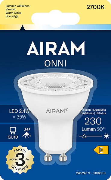 PAR16-reflektorlampa LED, 2,4 W, färgtemperatur varm vit 2700K, GU10-sockel, 230 lm, 510 cd, 36°, livslängd ca 15 000 h, storlek Ø 50 x 54 mm, blisterförpackning. Frekvens ~50/60 Hz. Driftstemperaturområde -30 … +40 °C. God färgåtergivning CRI > 80. Jämnt kontinuerligt spektrum utan färgförvrängning. Inget UV- eller IR-ljus. Innehåller inget kvicksilver. Tre års garanti.