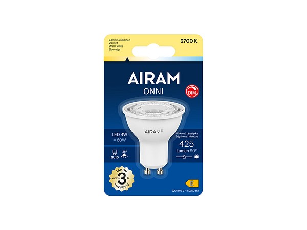 PAR16-reflektorkupa dimbar LED-lampa 4W, färgtemperatur varmvit 2700K, GU10-sockel, 425 lm 790 cd 36°, livslängd ca. 15 000 h, storlek ø 50 x 54 mm, blisterförpackning. Frekvens ~50/60 Hz. Driftstemperaturområde -30 ... +40 °C. Hög färgåtergivningsindex CRI > 80. Kontinuerligt jämnt spektrum, inga färgförvrängningar. Ingen UV- eller IR-strålning. Innehåller inget kvicksilver. Tre års garanti.