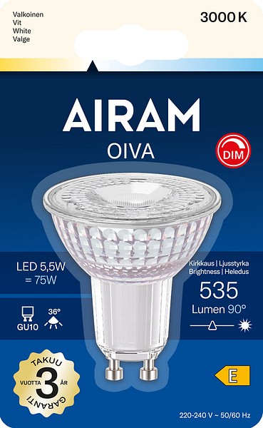 Oiva-seriens klar PAR16-spotglas dimbar LED-lampa 5,5W, färgtemperatur renvit 3000K, GU10-sockel, 535lm 900cd 36°, livslängd ca 15000h, storlek ø 50 x 54 mm, glas, blisterförpackning. Frekvens ~50/60Hz. Dimbar med LED-dimmer. Driftstemperaturområde -30 … +40 °C. Bra färgåtergivningsindex CRI > 80. Kontinuerligt jämnt spektrum, inga färgförvrängningar. Ingen UV- eller IR-strålning. Innehåller inget kvicksilver. Tre års garanti.