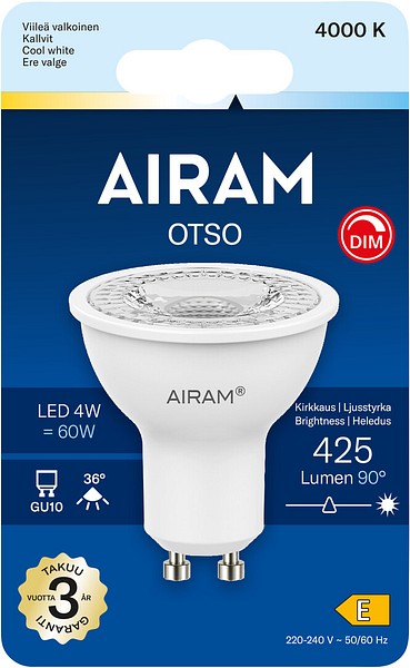 PAR16-reflektorlampa, dimbar LED 4 W, färgtemperatur neutralvit 4000 K, GU10-sockel, 425 lm, 790 cd, 36°, livslängd ca 15 000 h, storlek ø 50 x 54 mm, blisterförpackning. Frekvens ~50/60 Hz. Dimbar med LED-dimmer. Driftstemperaturområde -30 … +40 °C. Bra färgåtergivningsindex CRI > 80. Jämnt kontinuerligt spektrum, inga färgförvrängningar. Ingen UV- eller IR-strålning. Innehåller inget kvicksilver. Tre års garanti.