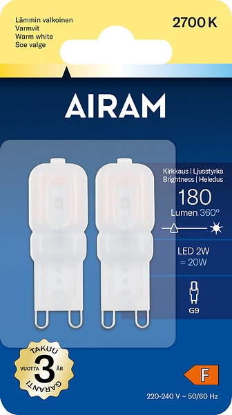 Dämpad glödlampkupa LED-lampa 2W, färgtemperatur varmvit 2700K, G9-sockel, 180 lm, livslängd ca. 15 000 h, storlek ø 16 x 51 mm, 2-pack blisterförpackning. Frekvens ~50/60 Hz. Driftstemperaturområde -30 ... +40 °C. Hög färgåtergivningsindex CRI > 80. Kontinuerligt jämnt spektrum, inga färgförvrängningar. Ingen UV- eller IR-strålning. Innehåller inget kvicksilver. Tre års garanti.