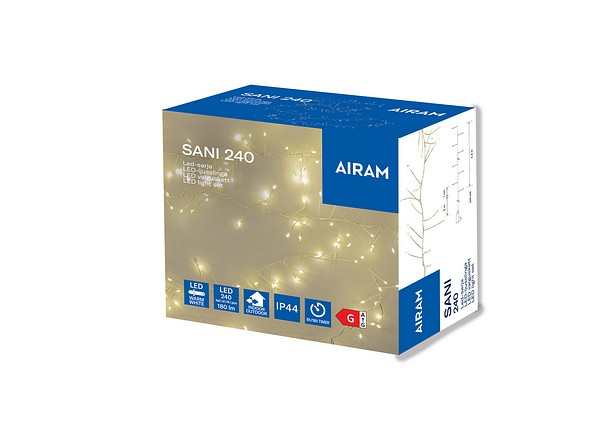 Sani 240 LED-ljusslinga. 240 st. varmvita micro LED-lampor, ej utbytbara. 180 lm. Längd: 2,4 m. Transformator: IP44 GS 4,5 V 3,6 W, medföljer. Genomskinlig sladd.