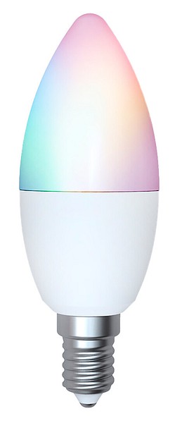 SmartHome opal ljuskupig CCT WiFi LED-lampa 4,9W, färgtemperatur kan justeras med SmartHome-appen 2700K (varmvit) – 6500K (dagsljus), RGB, färg på ljuset kan ändras. E14-sockel, 470 lm, livslängd ca 15 000 h, mått ø 37 x 106 mm, kartongförpackning. Frekvens ~50/60 Hz. Omedelbar tändning och full ljuseffekt, även vid kyla. Drifttemperaturområde -20 … +40 °C. Bra färgåtergivning CRI > 80. Kontinuerligt jämnt spektrum, inga färgförvrängningar. Ljuseffektivitet upp till 96 lm/W. Ingen UV- eller IR-strålning. Innehåller ej kvicksilver. Tre års garanti.