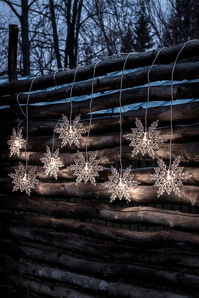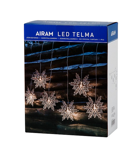 8 st. iskristaller som hänger på olika höjd på ett gardinliknande sätt. 8 st. varmvita LED-lampor, ej utbytbara, parallellkopplade. Ljusdelens längd är 1,75 m. Genomskinlig sladd. Transformator 31 V 3,6 VA IP44.