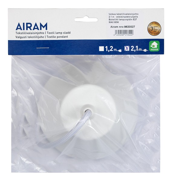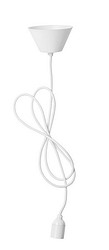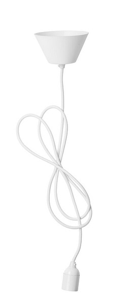 Textilöverdragen kabel med lamphållare i bakelit, vit färg. Utanpåliggande montering i tak. Takkopp i plast. Sladd H03VV-F, 2 x 0.75 mm², längd 2,100 mm. Kan förkortas till önskad längd. Endast för inomhusbruk. E27-lamphållare, max. 60 W, lampor säljs separat.