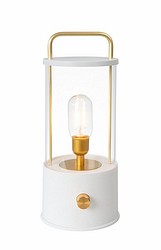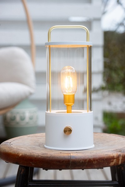 Stämningsfull och stilren LED-dekorationlykta för inomhusbruk. Antingen med svart eller vit stomme. Detaljerna, handtaget och ON/OFF-knappen, är guldfärgade. I kupan lyser en fast LED-glödtrådslampa med ett varmvitt sken, 2700 K. Man tänder och släcker ljuset genom att trycka på knappen, och ljuset kan dämpas steglöst genom att vrida på knappen. Batterifodralet finns på lyktans botten. Man kan ladda lyktan även via USB-C-porten.
