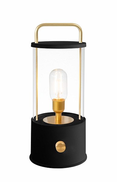 Stämningsfull och stilren LED-dekorationlykta för inomhusbruk. Antingen med svart eller vit stomme. Detaljerna, handtaget och ON/OFF-knappen, är guldfärgade. I kupan lyser en fast LED-glödtrådslampa med ett varmvitt sken, 2700 K. Man tänder och släcker ljuset genom att trycka på knappen, och ljuset kan dämpas steglöst genom att vrida på knappen. Batterifodralet finns på lyktans botten. Man kan ladda lyktan även via USB-C-porten.
