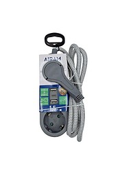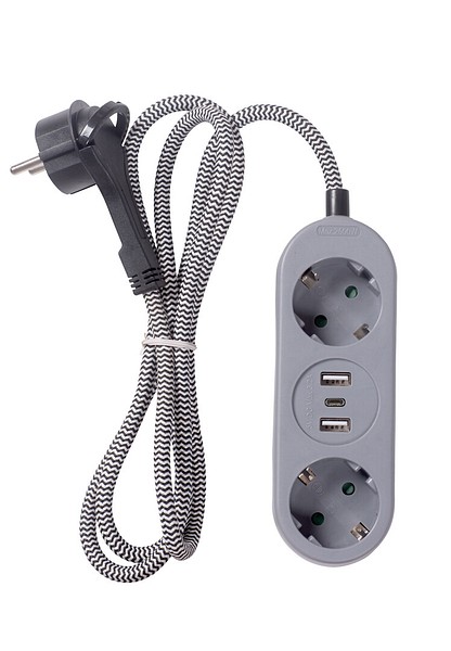 Kankaisella johdolla varustettu 2-osainen jatkojohto USB-porteilla. 2 x USB-A + 1 x USB-C (3,2 A), 1,5 m kaapeli, litteä pistotulppa. Maksimikuorma 3680 W.