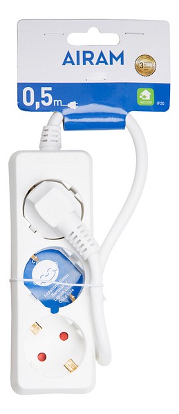 Maadoitettu jatkojohto sisäkäyttöön. Kotelointiluokka IP20. 3-osainen, pituus 0,5 m. H05VV-F 3 x 1,5 mm². Maksimikuorma 3680 W.