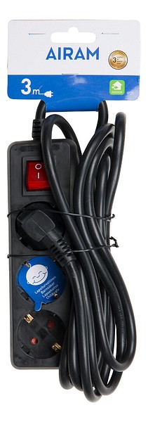 On/off-kytkimellä ja merkkivalolla varustettu maadoitettu jatkojohto sisäkäyttöön. Kotelointiluokka IP20. Musta johto. 3-osainen, pituus 3 m. H05VV-F 3 x 1,5 mm². Maksimikuorma 3680 W.