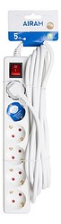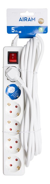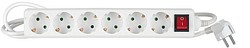 On/off-kytkimellä ja merkkivalolla varustettu maadoitettu jatkojohto sisäkäyttöön. Kotelointiluokka IP20. 6-osainen, pituus 5 m. H05VV-F 3 x 1,5 mm². Maksimikuorma 3680 W.