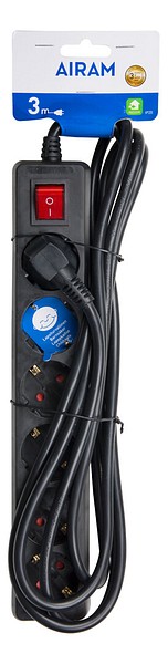 On/off-kytkimellä ja merkkivalolla varustettu maadoitettu jatkojohto sisäkäyttöön. Kotelointiluokka IP20. Musta johto. 6-osainen, pituus 3 m. H05VV-F 3 x 1,5 mm². Maksimikuorma 3680 W.