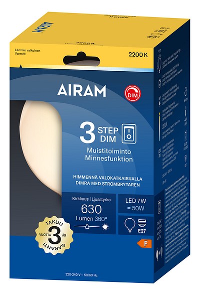 | LED G95 822 630lm E27 3ST DIM AM | Airam 3-step amber filamentti globe-95 E27 2200K 630lm |