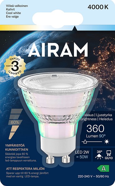 Airam A-luokan kohdekupu PAR16 GU10 4000K 360lm