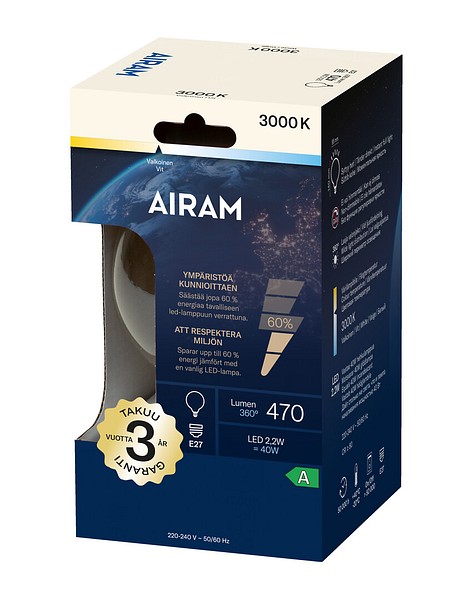 | LED G95 830 470lm E27 360 CL | Airam A-luokka kirkas globe-95 E27 3000K 470lm |