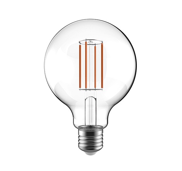Kirkas pallokupuinen filamentti led-lamppu 2,2W, värilämpötila puhdas valkoinen 3000K, E27-kanta, 470lm, polttoikä n. 50000h, koko ø 95 x 140 mm, pahvipakkaus. Taajuus ~50/60Hz. Energiatehokkuusluokka A. Välitön syttyminen ja täysi valontuotto, myös pakkasessa. Toimintalämpötila-alue -30 ... +40 °C. Hyvä värintoistoindeksi CRI > 80. Jatkuva tasainen spektri, ei värivääristymiä. Ei himmennettävä. Valotehokkuus jopa 210 lm/W. Ei UV- tai IR-säteilyä. Ei sisällä elohopeaa. Viiden vuoden takuu.