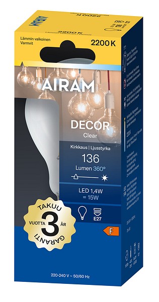 Decor Clear -sarjan kirkas vakiokupuinen filamentti led-lamppu 1,4W, värilämpötila lämmin keltainen 2200K, E27-kanta, 136lm, polttoikä n. 15000h, koko ø 60 x 108 mm, kupu lasia, pahvipakkaus. Taajuus ~50/60Hz. Lampulla on täysin ympärisäteilevä valonjako, se sopii hyvin plafondeihin ja pöytävalaisimiin. Toimintalämpötila-alue -20 ... +40 °C. Hyvä värintoisto CRI > 80. Jatkuva tasainen spektri, ei värivääristymiä. Ei UV- tai IR-säteilyä. Ei sisällä elohopeaa. Kolmen vuoden takuu.