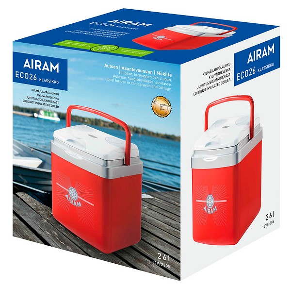 Airam ECO26 Klassikko -kylmälaukku toimii sekä 12 V että 230 V jännitteellä ja tarjoaa jopa 60 % energiansäästön ECO-asetuksella. Nopea jäähdytys mahdollistuu kahdensuuntaisen tuuletinmoottorin ansiosta, ja kylmätila säilyy tehokkaasti polyuretaanieristyksen avulla. Jäähdytys ECO-asennossa 8–14 °C ja MAX-asennossa jopa 18 °C alle ympäristön lämpötilan. Tilavuus 26 litraa, sopii 1,5 litran pulloille pystyasennossa.
