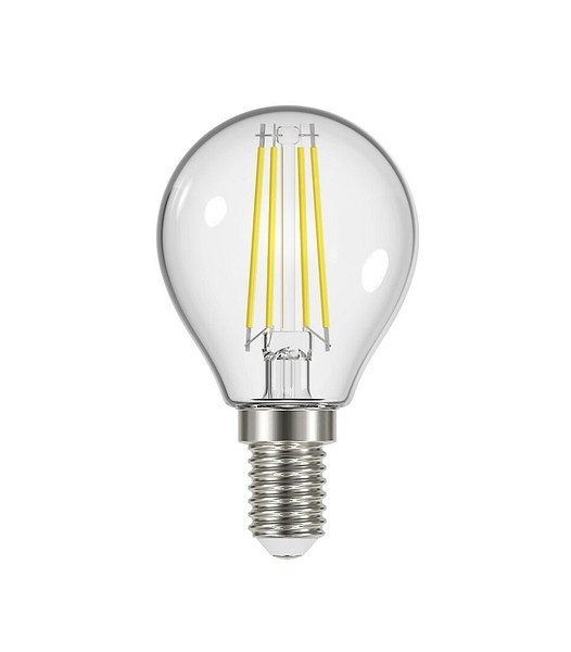 Kirkas pienkupuinen himmennettävä filamentti led-lamppu 3,7W, värilämpötila lämmin valkoinen 2700K, E14-kanta, 470lm, polttoikä n. 15000h, koko ø 45 x 78 mm, 3 kpl pahvipakkauksessa. Taajuus ~50/60Hz. Toimintalämpötila-alue -30 … +40 °C. Hyvä värintoistoindeksi CRI > 80. Jatkuva tasainen spektri, ei värivääristymiä. Ei UV- tai IR-säteilyä. Ei sisällä elohopeaa. Kolmen vuoden takuu.