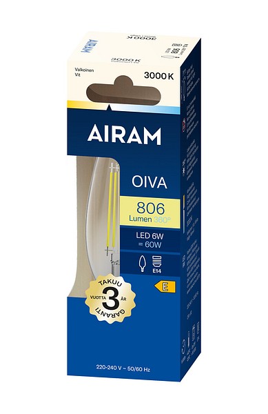 | LED A60 830 806lm E27 OIVA CL | Airam Oiva kirkas filamentti vakiokupu E27 3000K 806lm |
