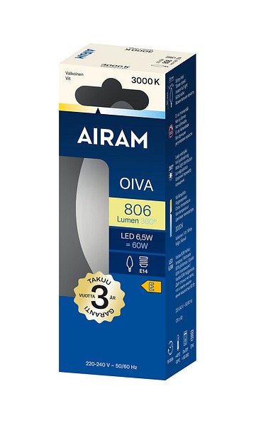 | LED C35 830 806lm E14 360 OIVA OP | Airam Oiva opaali 360° kynttiläkupu E14 3000K 806lm |