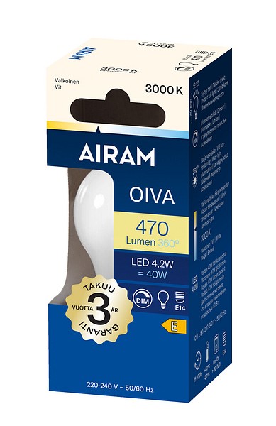 | LED C35 830 470lm E14 360 OIVA OP | Airam Oiva opaali 360° kynttiläkupu E14 3000K 470lm |