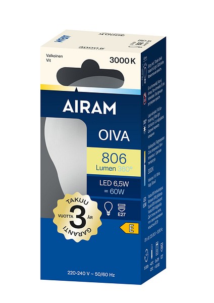 | LED A60 830 470lm E27 360 OIVA OP | Airam Oiva opaali 360° vakiokupu E27 3000K 470lm |