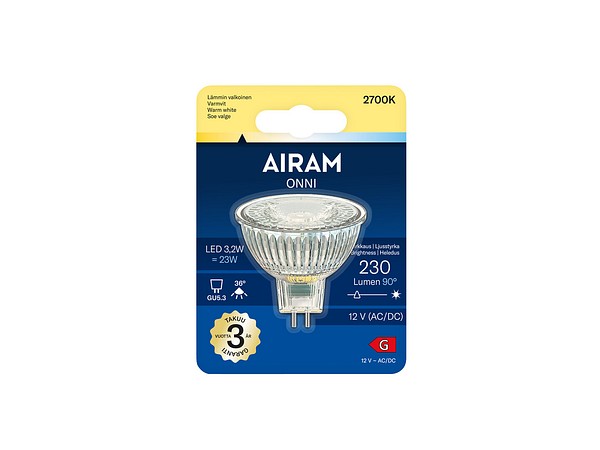 | LED FG MR16 827 230lm GU5.3 12V 36D | Airam Onni kohdekupu MR16 GU5.3 12V 2700K 230lm/580cd |