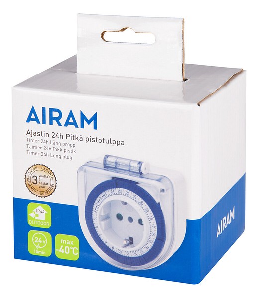 Ulkokäyttöön soveltuva ajastin, jossa pitkä pistotulppa. Pitkä pistotulppa on hyvä syviin pistorasioihin, joita monesti on esim. autojen lämmitystolpissa. Ajastimen jako 15 minuuttia. Ajastimella on lukuisia käyttötarkoituksia, kuten auton lohkolämmittimen tai pihakoristevalojen automaattinen ajastaminen. Pakkaskesto -40 °C.
