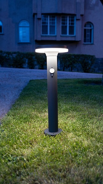 Tyylikäs solar-valaisin hämäräkytkimellä ja liiketunnistimella. Valaisee alaspäin. Kolme toimintavaihtoehtoa. Perusasetuksella valaisin syttyy illan hämärtyessä ja palaa kiinteästi 75 lm voimakkuudella. Toisella asetuksella liiketunnistin aktivoituu: aina liikettä havaitessaan valoteho on 400 lm ja laskee sitten 75 luumeniin. Kolmannessa asetuksessa valo syttyy vain liikkeestä liiketunnistimella 600 lm voimakkuudella ja sammuu hetken kuluttua. Ominaisuus on erinomainen poluilla ja kulkuväylillä. Valotoimintoa voi vaihtaa painamalla on/off-nappia 1-3 s ajan. Led kirkas, ei vaihdettava. Runko kestää auringon ja meri-ilmaston rasitukset haalistumatta. Materiaali ruostumaton teräs, sävy harmaa. Kiinnitä tukevaan alustaan mukana olevilla ruuveilla tai käytä maajalkaa.