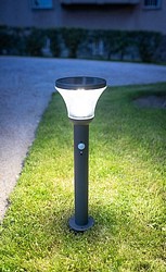 Näyttävä solar-valaisin hämäräkytkimellä ja liiketunnistimella. Laaja valaisukulma. Kolme toimintavaihtoehtoa. Perusasetuksella valaisin syttyy illan hämärtyessä ja palaa kiinteästi 75 lm voimakkuudella. Toisella asetuksella liiketunnistin aktivoituu: aina liikettä havaitessaan valoteho on 400 lm ja laskee sitten 75 luumeniin. Kolmannessa asetuksessa valo syttyy vain liikkeestä liiketunnistimella 600 lm voimakkuudella ja sammuu hetken kuluttua. Ominaisuus on erinomainen poluilla ja kulkuväylillä. Valotoimintoa voi vaihtaa painamalla on/off-nappia 1-3 s ajan. Led kirkas, ei vaihdettava. Runko kestää auringon ja meri-ilmaston rasitukset haalistumatta. Materiaali ruostumaton teräs, sävy harmaa. Kiinnitä tukevaan alustaan mukana olevilla ruuveilla tai käytä maajalkaa.