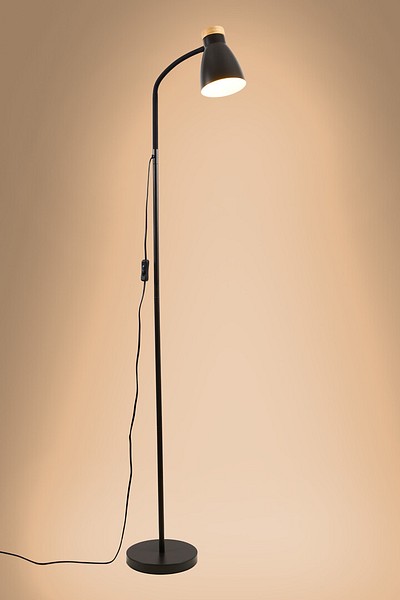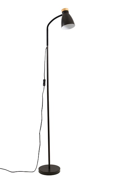 Anoom jalkavalaisin, korkeus 155 cm, mattamusta teräskupu Ø 12 cm. Yksityiskohdat sertifioitua puumateriaalia. Lamppu max 5 W led E27, ei sisälly pakkaukseen. On/off-kytkin johdossa, tekstiilijohto 1,8 m.