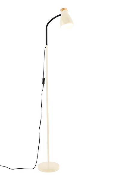 Anoom jalkavalaisin, korkeus 155 cm, mattabeige teräskupu Ø 12 cm. Yksityiskohdat sertifioitua puumateriaalia. Lamppu max 5 W led E27, ei sisälly pakkaukseen. On/off-kytkin johdossa, tekstiilijohto 1,8 m.