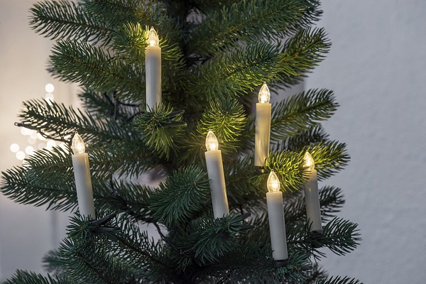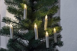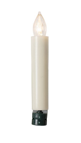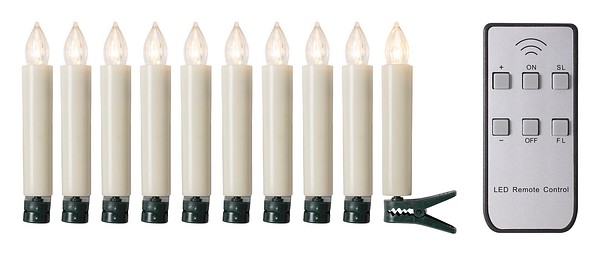 Setti irrallisia, johdottomia paristotoimisia kuusenkynttilöitä, 10 kpl. Voidaan asettaa myös katettuun ulkotilaan. Kynttilöiden eri toimintoja ohjataan kaukosäätimellä: säädä valon voimakkuutta ja liekkitoimintoa. Kaukosäätimen ajastintoiminnolla kynttilät syttyvät automaattisesti. Yhdellä kaukosäätimellä voi ohjata useampaa kynttiläsarjaa! Kynttilän voi irrottaa pidikkeestä ja asettaa esim. tavalliseen kynttilän-jalkaan. Materiaali muovi.