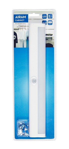 Pitkänmallinen Cabinet PIR-liiketunnistinvalo esim. mökille tai paikkoihin joihin ei sähkövirta yllä. Tunnistusalue 60/120°, sensor 4 m. Päällä aina 25 sek. liikkeen havaitsemisesta. Valonlähde led 80 lm, 3000 K. Automaattinen päälle/pois-toiminto. Runkomateriaali ABS ja polykarbonaatti (PC). Sisäkäyttöön, IP20. Toimii 4 x AA 1,5 V paristoilla, ei sisälly. Paristojen kesto n. 24-30 h. Helppo kiinnittää pintaan teipillä tai ruuveilla. Asennustarvikkeet sisältyvät.