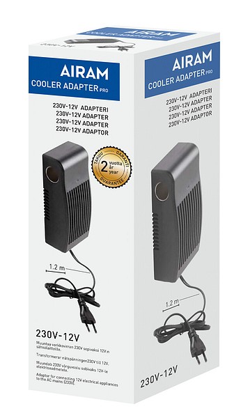 Kylmälaukun lisävaruste. Verkkovirta-adaperi muuntaa verkkovirran 12 V sähkölaitteille sopivaksi. Ulostulo DC 12 V 5 A.