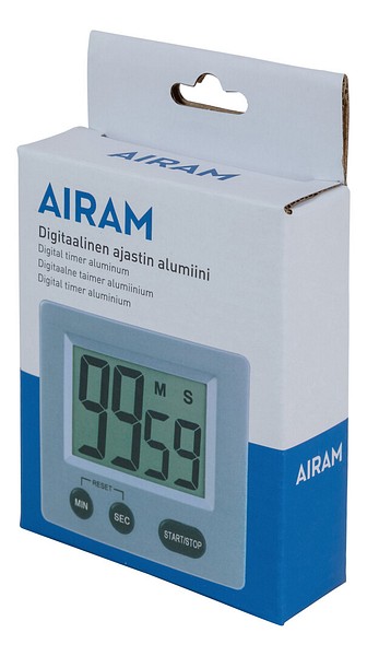 Helppokäyttöinen digitaalinen ajastin selkeällä numeronäytöllä ja sekuntikellolla. Taustapuolella magneetti ja seisontatuki. Materiaali alumiini. Ajastus maks. 99:59 min. Paristo 1 x AAA, ei sisälly.
